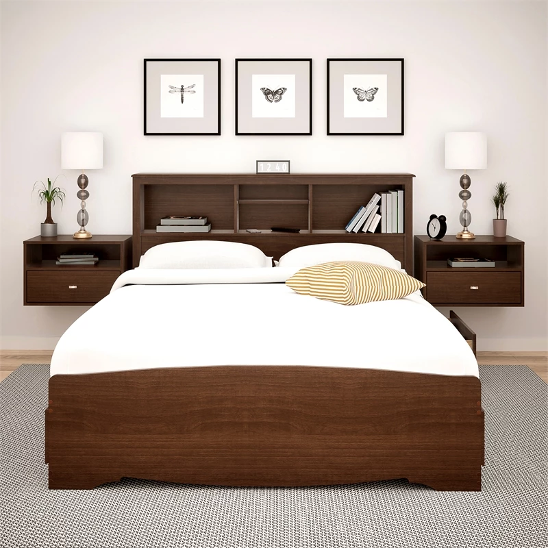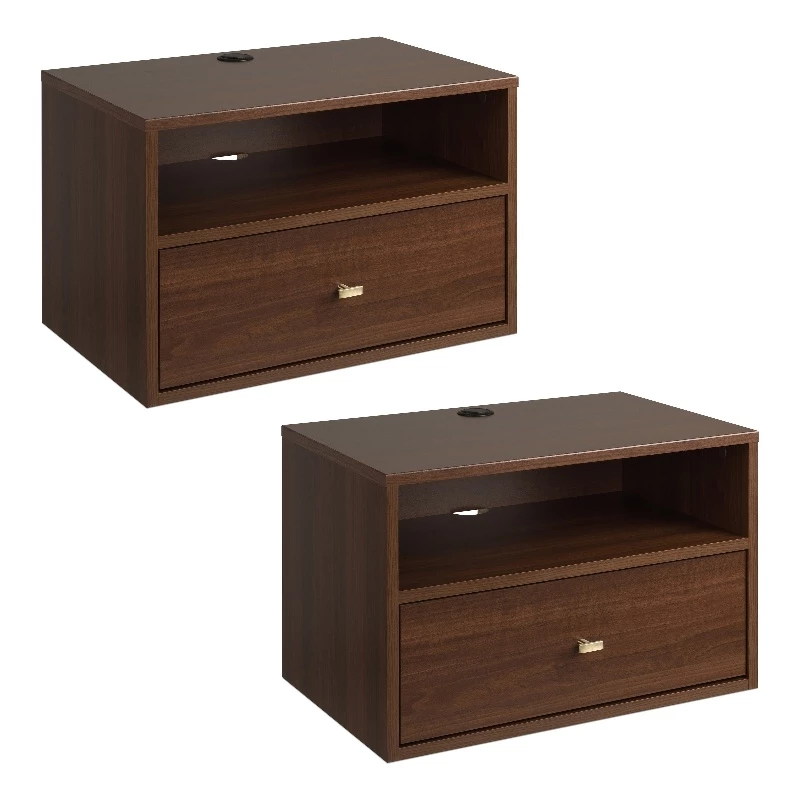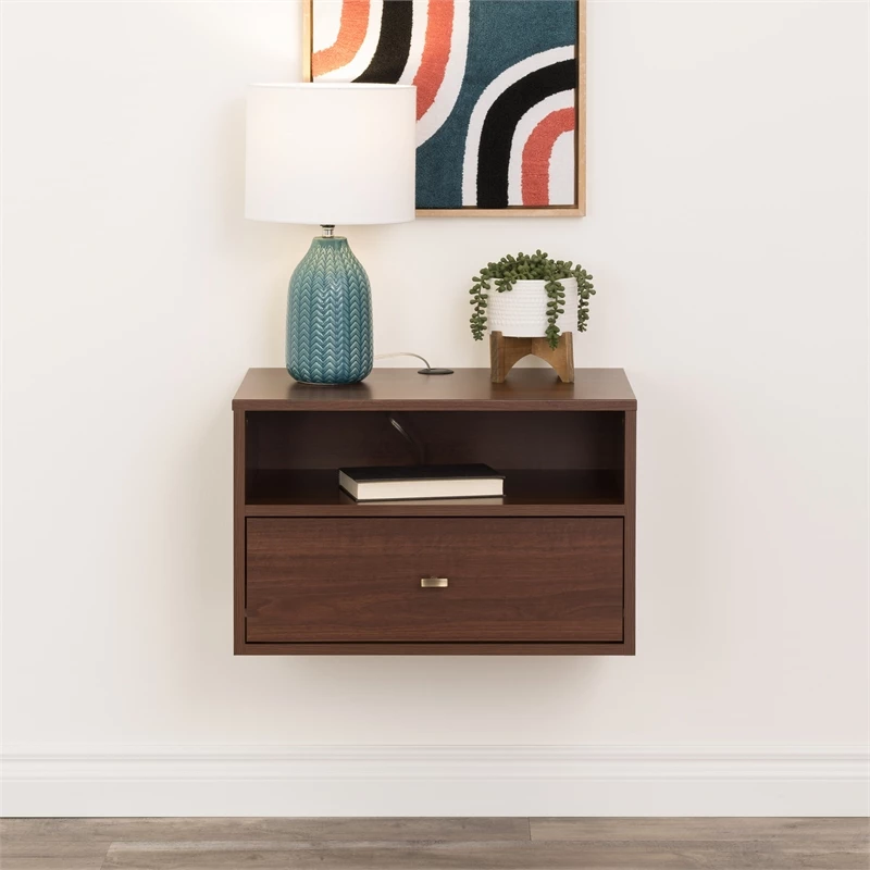This Prepac Cherry Floating Nightstand With Open Shelf is the ideal companion for your modern bedroom. With both a drawer and an open compartment, it holds all your typical bedside essentials like books, magazines and glasses. For your electronic devices, both the top surface and the compartment have openings to manage cords. The hanging design gives you the flexibility to place it at any height and saves valuable floor space. Prepac’s innovative mounting rail makes it easy to put up – you just have to find the wall studs. Constructed from CARB 2 compliant, laminated engineered wood. Ships Ready to Assemble, includes an instruction booklet for easy assembly.