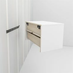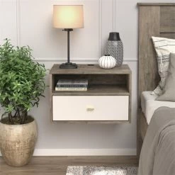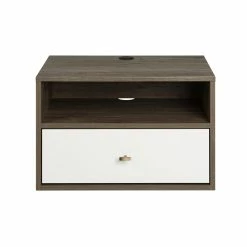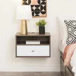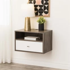 This Prepac Multi-Color Floating Nightstand With Open Shelf is the ideal companion for your modern bedroom. With both a drawer and an open compartment, it holds all your typical bedside essentials like books, magazines and glasses. For your electronic devices, both the top surface and the compartment have openings to manage cords. The hanging design gives you the flexibility to place it at any height and saves valuable floor space. Prepac’s innovative mounting rail makes it easy to put up – you just have to find the wall studs. Constructed from CARB 2 compliant, laminated engineered wood. Ships Ready to Assemble, includes an instruction booklet for easy assembly.