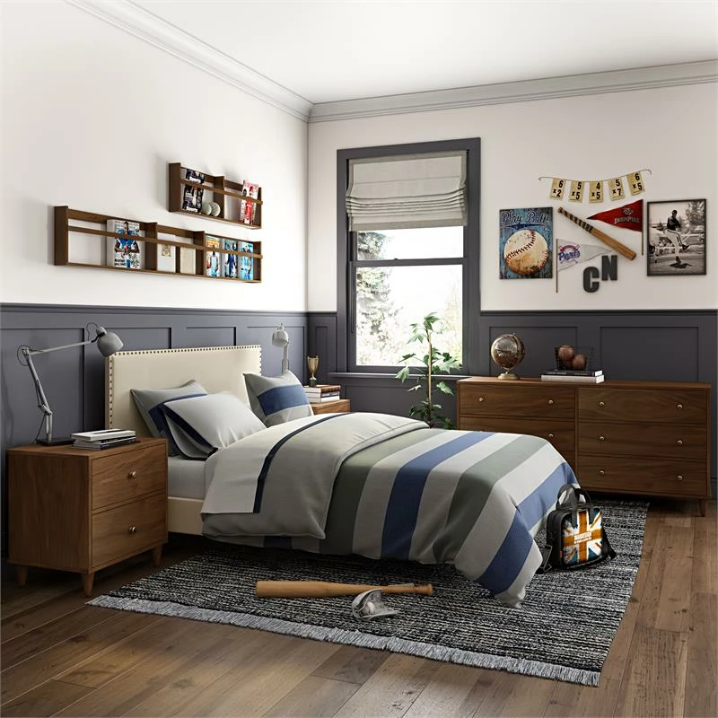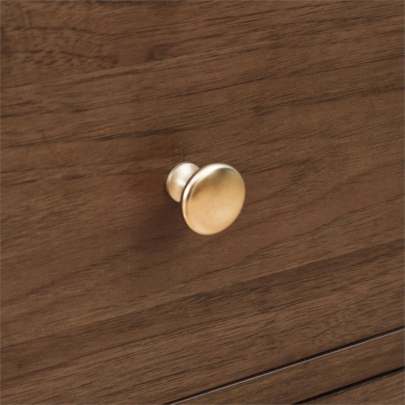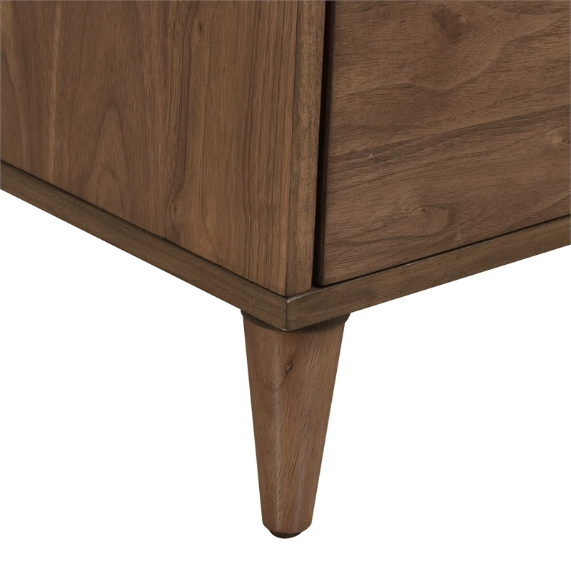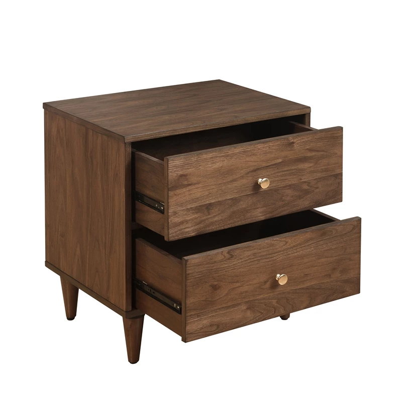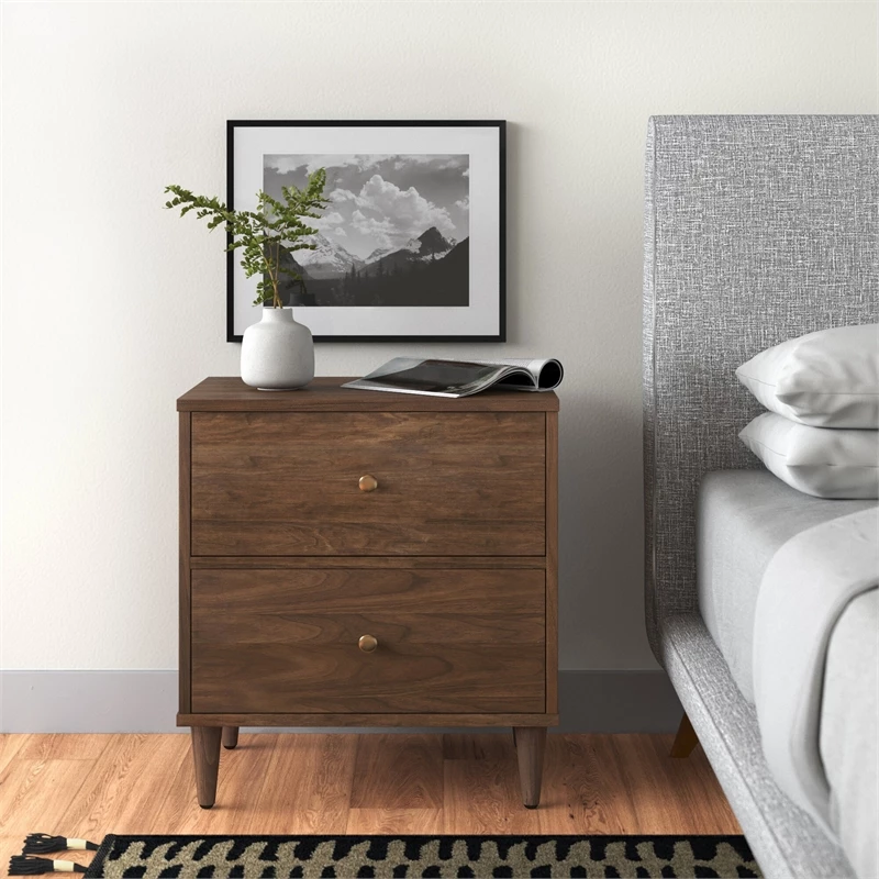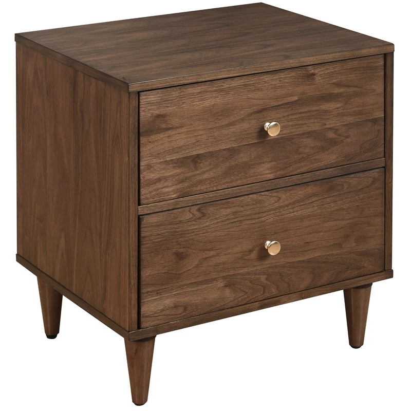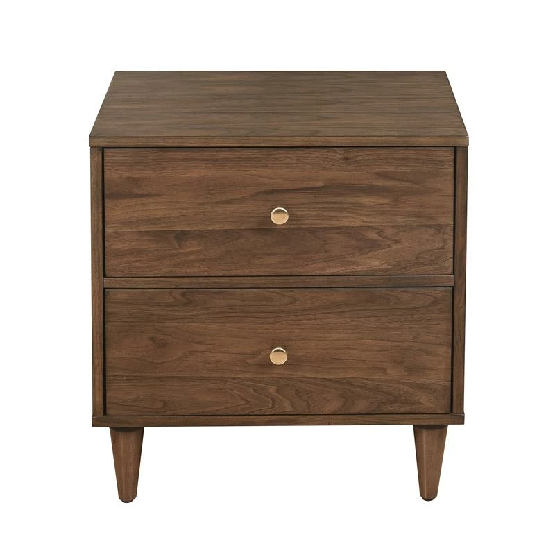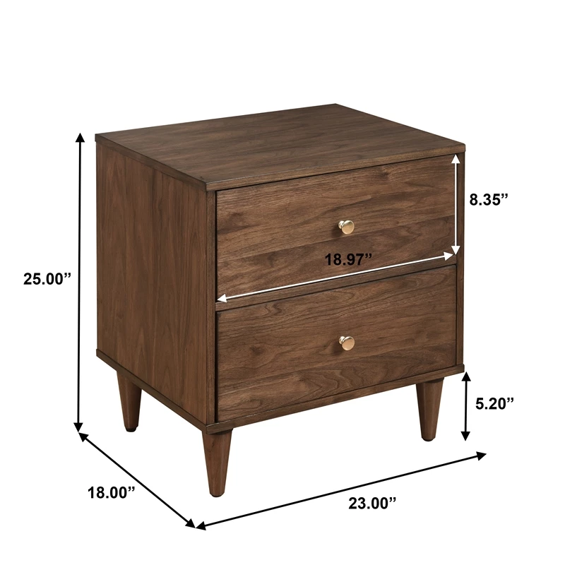 Practical and attractive, this 2-drawer nightstand blends seamlessly with modern decor and makes a smart addition to a bedroom. This mid-century nightstand in a walnut brown finish includes 2 drawers that slide easily on metal side-mounted guides that slide easily on metal side-mounted guides and can be used to keep your bed side essentials neat and organized. Sleek metal pulls in gold-tone finish add to the streamlined aesthetic. Combine with other units in the collection to create a room that’s smart and stylish.