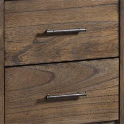 A simple design with emphasis on an attractive finish featuring a satin finish with subtle distressing. Wide pilasters and thick tops provide for a solid and durable look. This nightstand has plywood drawer sides with paper drawer bottom interiors, French and English dovetail construction, and kenlin drawer guides. Oversized bronze transitional handles. Beautiful mindi veneers have slight distressing with wormholes and a warm satin finish.