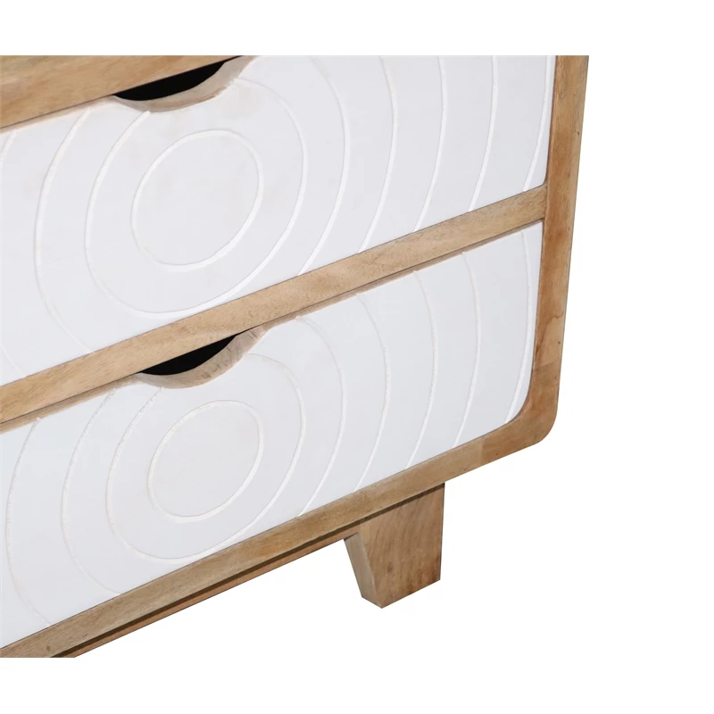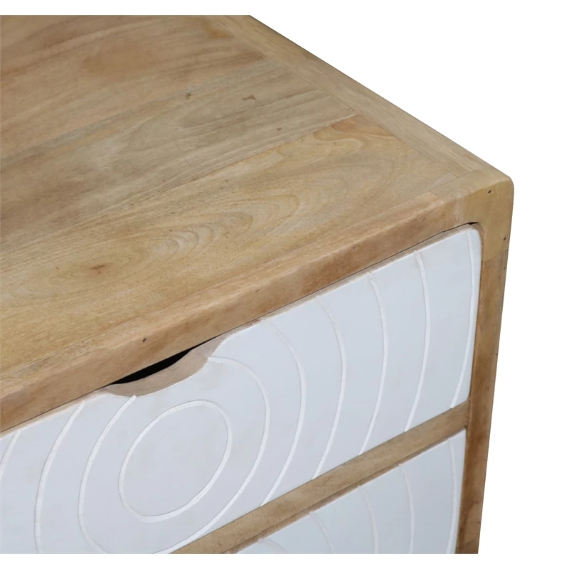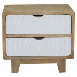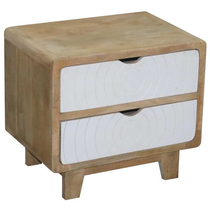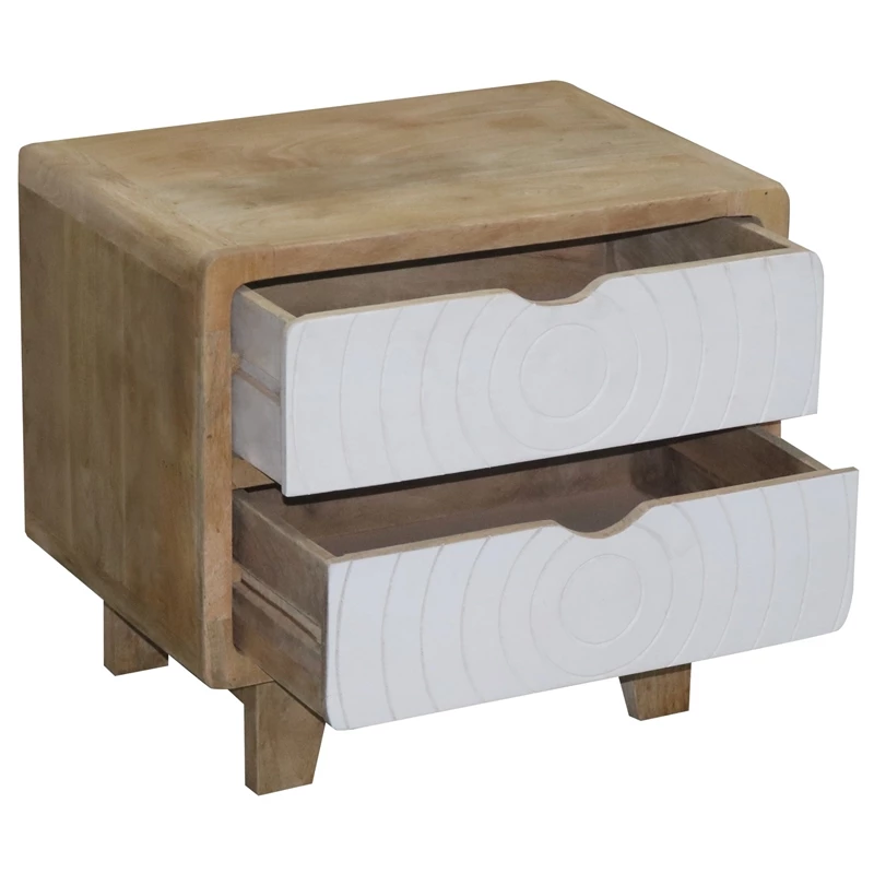 An “Art Deco” inspired nightstand surely to become a favorite. The perfect size and style for almost any modern style bed. A cool modern style in a natural mango finish with 2 drawers in a contrast chalk white finish with a carved circular design. Works great as a nightstand but also pulled up by a comfy sofa or chair as well. Make a statement with this one.