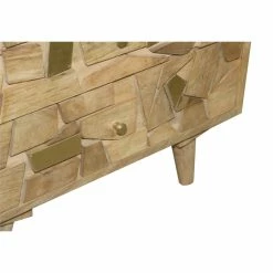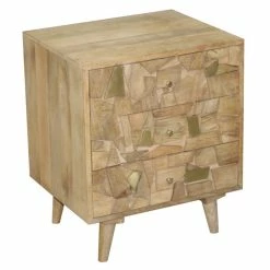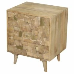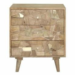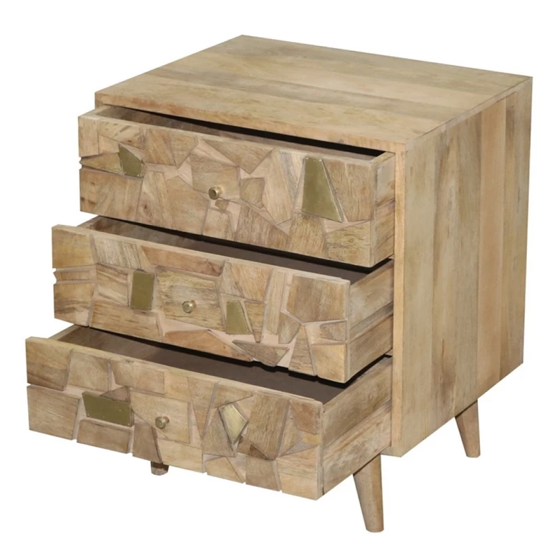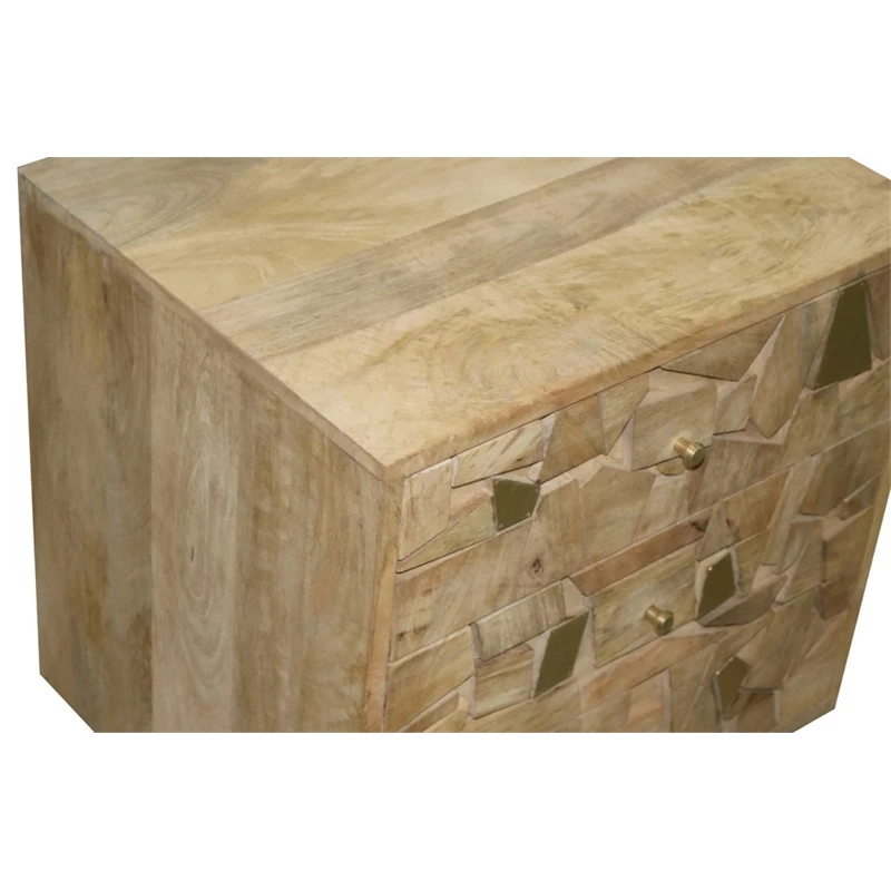 No better way to spice up a bedroom than with a beautiful hip new nightstand. This sassy little number is constructed of mango wood and MDF. Drawer fronts have interesting asymmetrically shaped wood pieces randomly placed with an occasional brushed gold accent surprise. Each drawer also has a delicate but very cool little brushed gold knob that is absolutely the perfect finishing touch to this little masterpiece. Is almost more like a piece of jewelry rather than furniture.