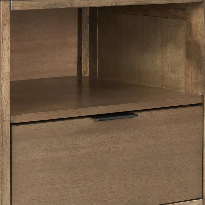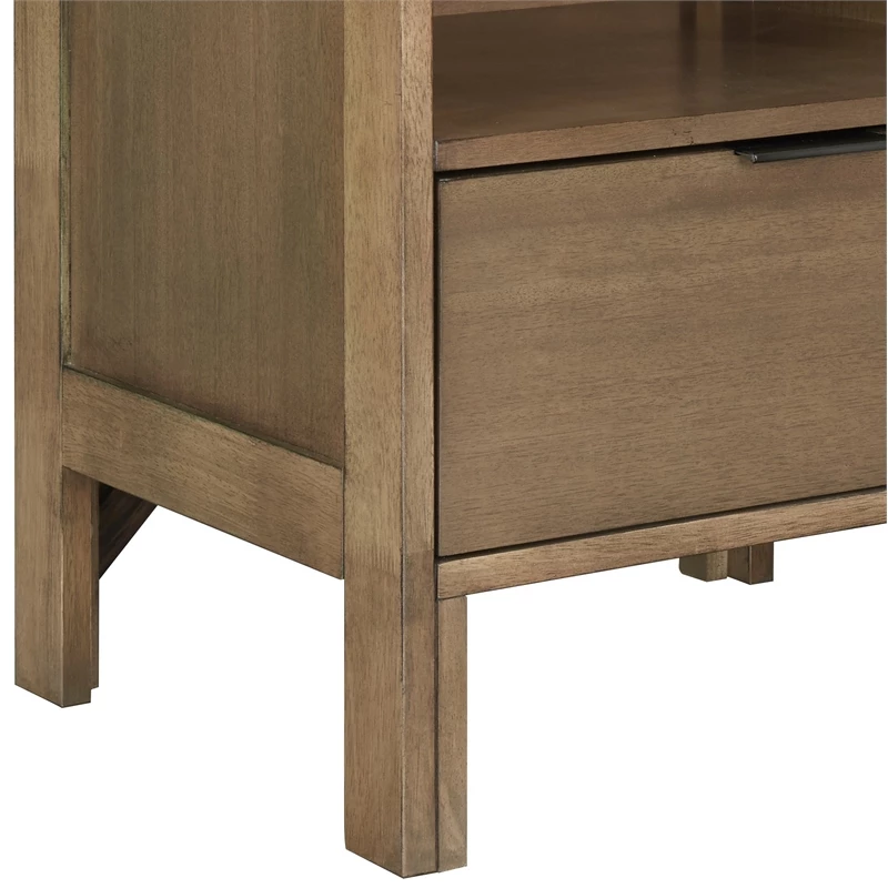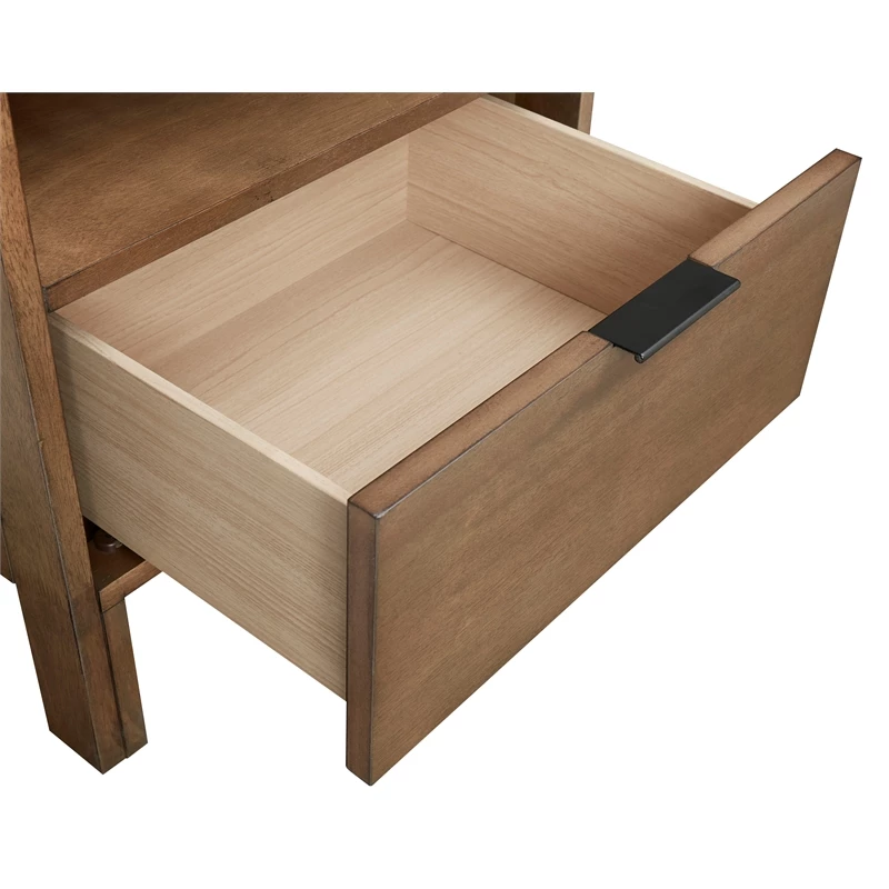 Natural looking Jute finish is hand-applied and will be durable for years to come. This nightstand has straight pilasters and legs, inset drawers with framed ends, plywood drawers have paper bottoms featuring a French front and English back dovetail with Kenlin drawer guides, and bronze linear hardware is fastened at the top of the drawer to provide a clean look. This night stand contains one drawer with an open area for display.