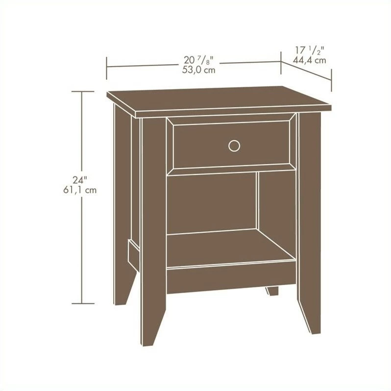 Add some style to your bedroom with this fabulous nightstand from the Shoal Creek® collection. Find room for all your do-dads and gadgets in the easy-to-access drawer that opens and closes on smooth metal runners. Your bedroom essentials are never far out of reach with this single drawer nightstand. The lower open shelf provides you with even more storage for décor, books, a small organizing bin, and more. The spacious top surface of this nightstand with open storage has enough room for an alarm clock, lamp, and your reading glasses. Assembly is a breeze with slide-on moldings that make putting together your 1-drawer nightstand quick and easy. Optional Hidden Wireless Qi Compatible Charger by Eggtronics (425905) allows smartphone charging without all the fuss of cords or cables (sold separately on sauder.com). Finished in a beautiful Oiled Oak®, this bedside table with storage is just what your bedroom needs.
