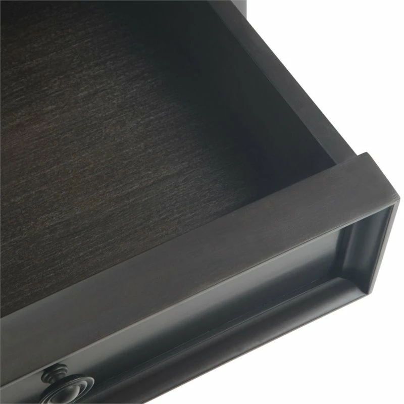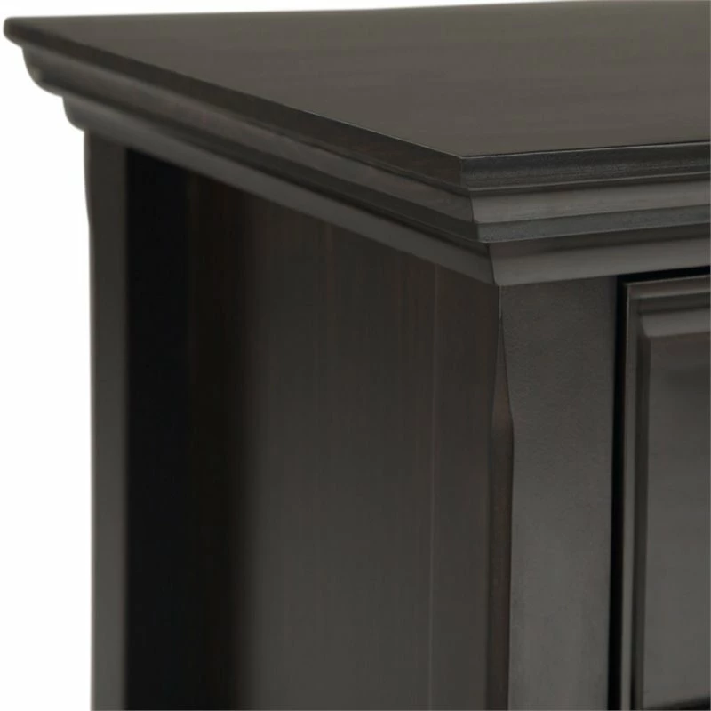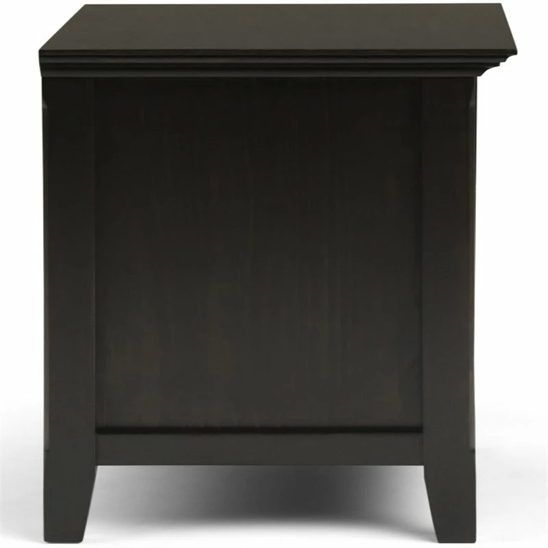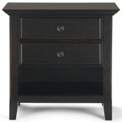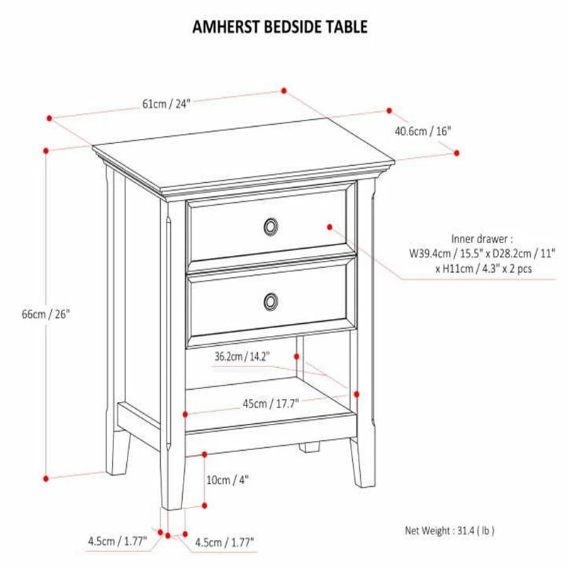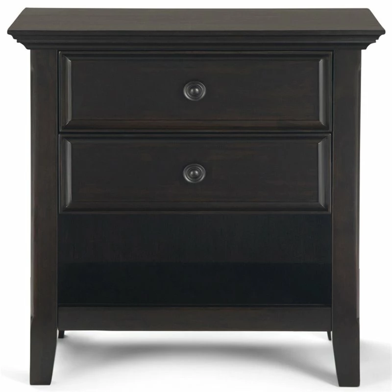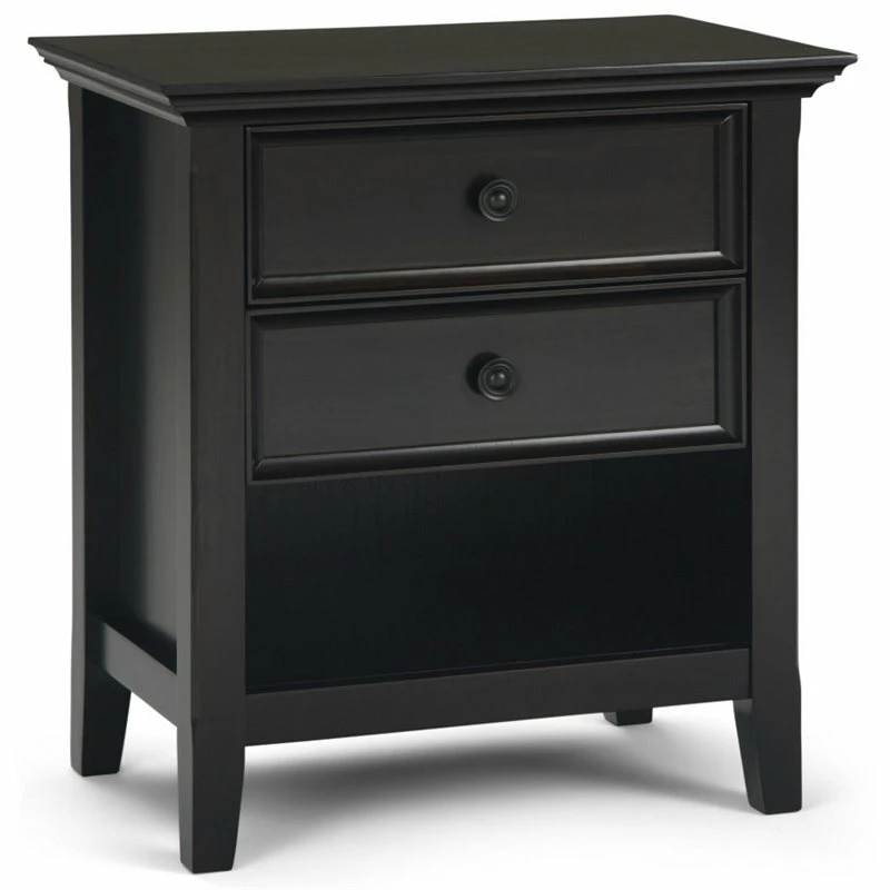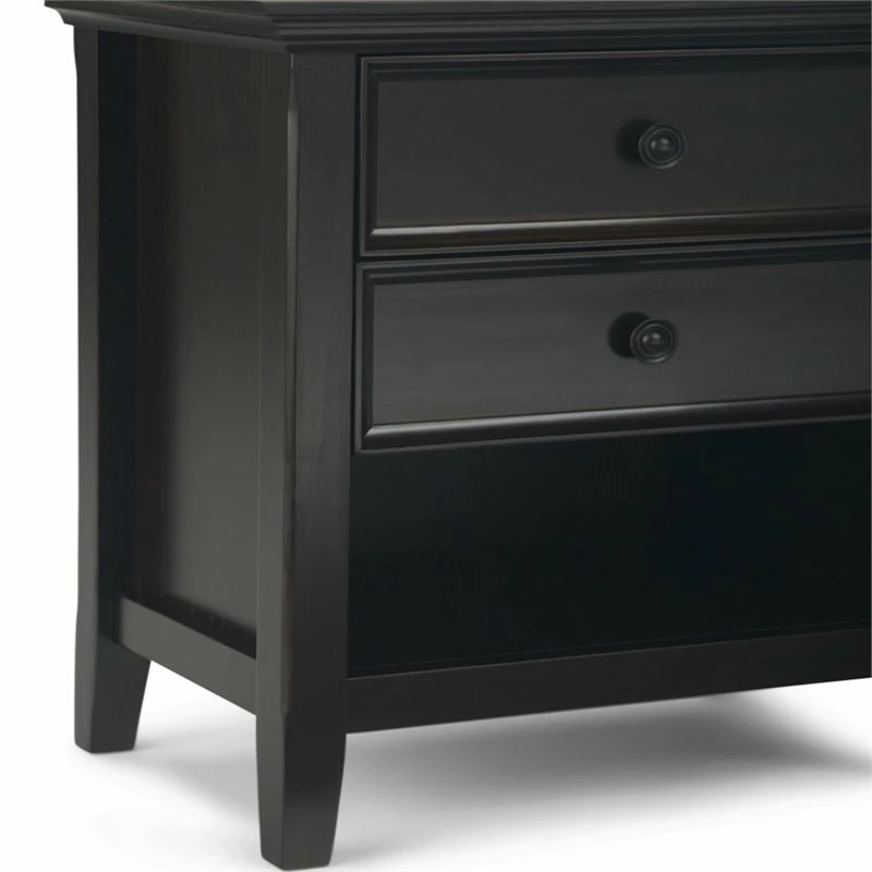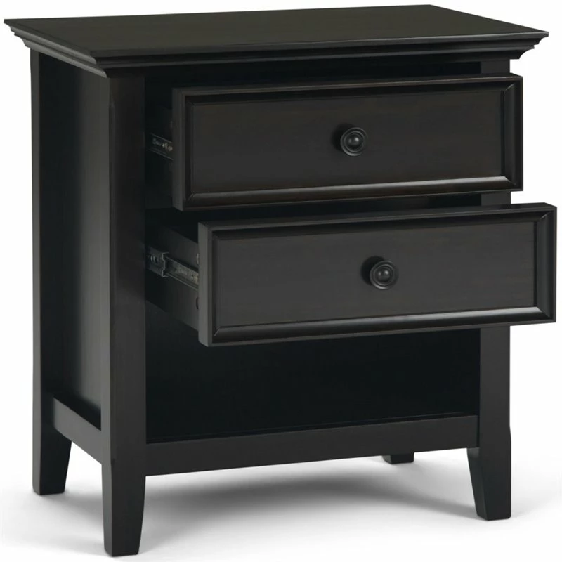 Keep your bedtime essentials within reach on the Simpli Home Amherst Bedside Table. The ideal bedside accessory, the nightstand has two drawers for concealed storage of small items as well as an open shelf on the bottom for books and larger items. Constructed of solid wood, this product is a sturdy piece that will fit wonderfully into your bedroom, living or family room décor.