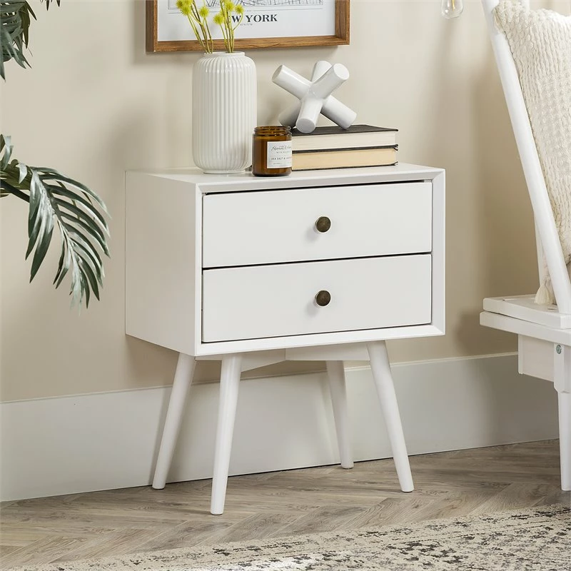 Looking for a side table that will uplift your space? This Mid-century modern nightstand is the one for you. With long, angled legs and beveled front details, the end table’s sophisticated style will enhance any bedroom or living room. All of your essentials can stay out of sight but close at hand within the two drawers. Made with solid pine wood responsibly harvested from renewable forests, this sustainably-sourced piece will ease your environmental conscience. Plus, assembly is simple—just attach the legs to the top portion and you’re all set!