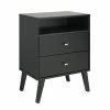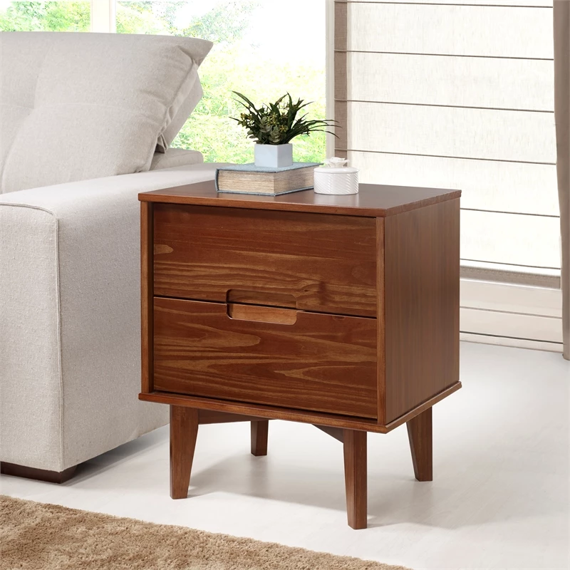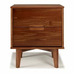 This nightstand will add a stylish finish to your bedroom with the mid century modern and transitional design. With a solid pine wood construction in a stained finish, featuring angled legs and a unique cutout handles that add to the design. Including two storage deep drawers for putting away books, accessories, and more. This nightstand can also be used as a side table or end table in your living room beside your couch or armchair.