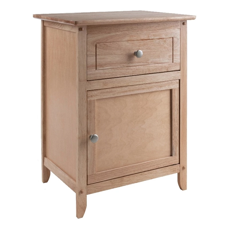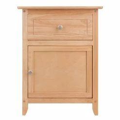 Add extra table space to a living room, den or bedroom with the versatile and ageless design of the Winsome Wood Eugene Accent Table. Whether you decide to put your alarm, lamp or family photo, the clean and simple design of this table allows it to blend well with most home decor. This Winsome classic is finished in a clear lacquer to highlight the natural wood grain and adorned with two satin nickel knobs for a sticking contrast of elegance. Featuring a small pull-out drawer for storing pens, notepads, remote control and small accessories, organized and out of sight. The bottom door opens up to more storage space. Keep photo albums accessible or some of your favorite night time storybooks within reach in the spacious compartment. For larger beds, sofas and/or rooms, try adding one accent table on each end (each sold separately). Like many Winsome Wood products, the Eugene collection is available in four classic finishes to choose from. Conveniently packed and shipped in 1 box and ready to assemble. Constructed of a combination of composite wood and solid beech wood top panel and frame for a long-lasting durability.